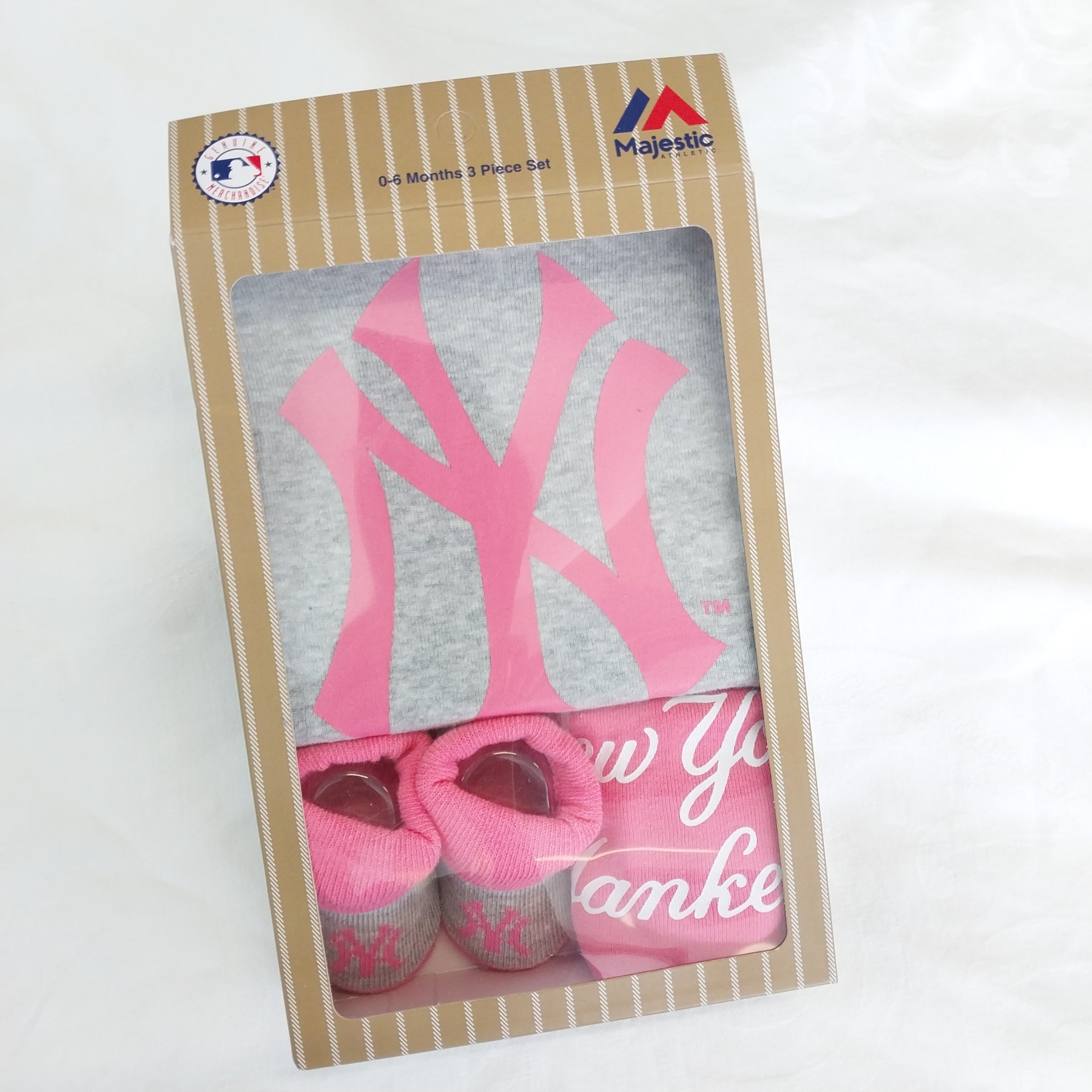 Celebrate your little fan’s first steps with this adorable New York Yankees Baby 3 Piece Gift Set! Perfect for ages 0-6 months, this playful set includes a cozy onesie featuring the iconic Yankees logo, a matching bib, and soft booties in charming pink and grey. Brand new and ready to keep your baby comfy and stylish while showing off team spirit!