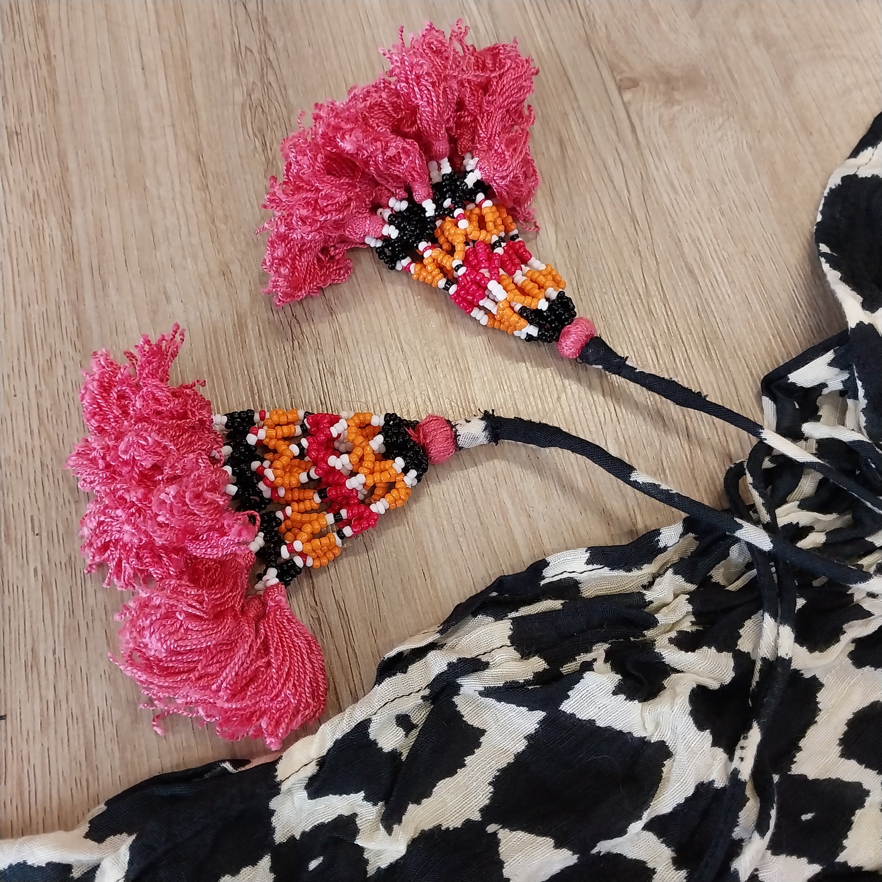 Step into summer fun with this Australian Label , Jets by Jessika Allen beach dress/kaftan in a vibrant multicoloured design. Featuring an adjustable waist with charming beaded tassel drawstrings and a playful lace-up front, it’s perfect for sunny days by the sea. Lightweight and breezy, this size M beauty offers a comfortable fit and a splash of style for your beachside adventures.W 80 cm ,  L 88cm . In very good condition, it’s ready to brighten your wardrobe and your day!
