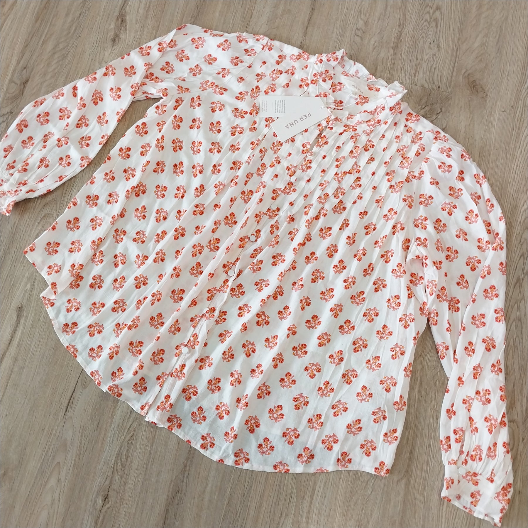 This Per Una blouse is a playful summer essential in breezy 100% viscose. Size 12 with a comfortable 60 cm flat width and 62 cm length, it features charming pleats at the shoulders and a ruffle collar that adds a flirty touch. The button-and-loop front fastening keeps it effortless, while full-length sleeves with gathered cuffs bring subtle drama. Perfect for sunny days or layering into cooler evenings with a fun, feminine flair. Brand new with tags!