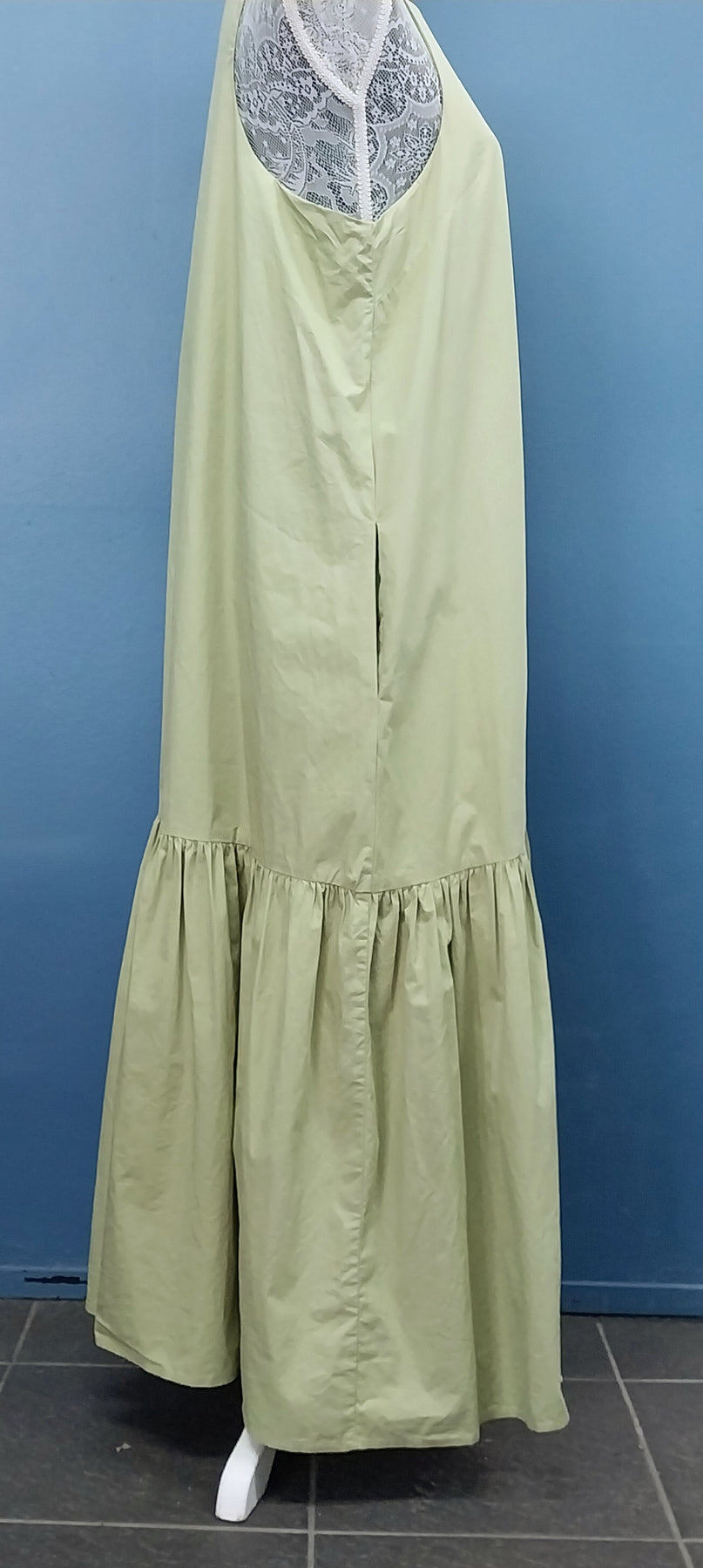 This playful Superette Maxi Dress in a fresh leaf green is made from 100% cotton for breathable comfort. Designed in size 10, it features a flattering round neck and handy side pockets for your essentials. The back neck closes with a charming button and loop, while the lined bodice and gathered lower skirt add a fun, flirty flair. Measuring 51cm flat across the bust and 128cm from shoulder to hem, it’s perfect for twirling through your day. In very good condition, this dress combines comfort and style with a cheeky twist!
