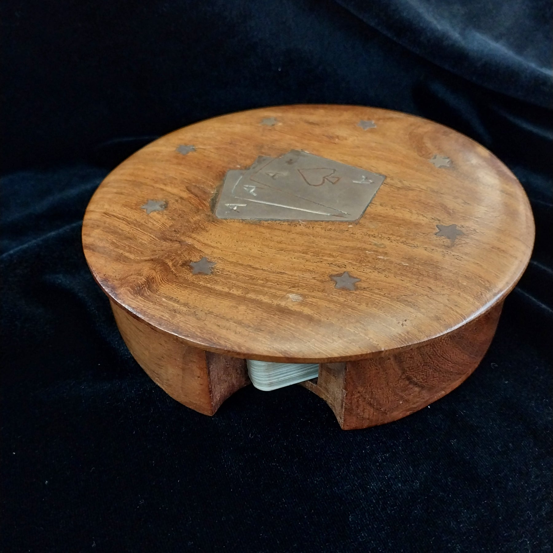 Add a touch of nostalgia to your game nights with this charming vintage wooden card box. Measuring 13 cm in diameter, it showcases a striking brass inlay featuring the Ace of Spades surrounded by brass stars. Complete with cards inside, this delightful set is in very nice condition and ready to spark fun and friendly competition. Perfect for card lovers who appreciate classic style with a playful twist!