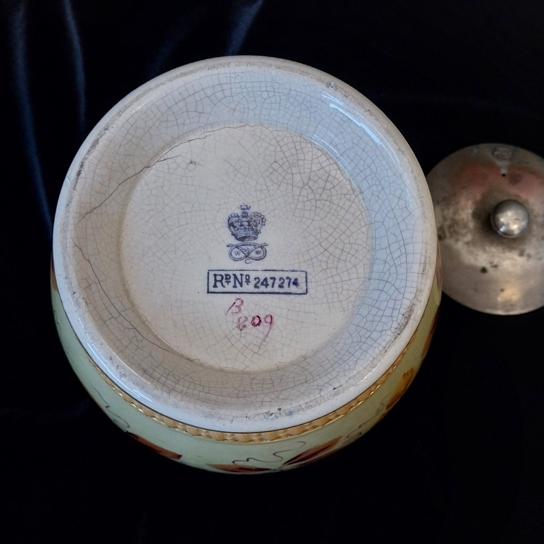 Discover the timeless charm of this exquisite Vintage Wood & Co. Staffordshire biscuit barrel, a true collector's piece from the golden age of British ceramics. Standing 15cm tall with matching depth, this hand-painted treasure showcases stunning period colours and intricate design work. The elegant EPNS handle and metal lid add refined sophistication, while authentic crazing and surface cracks tell the story of its cherished history. Bearing the distinctive crowned Staffordshire knot maker's mark with W&W initials—used exclusively between 1915 and 1932—this barrel is a genuine testament to early 20th-century craftsmanship. Perfect for collectors seeking authentic vintage ceramics with documented provenance and undeniable character.