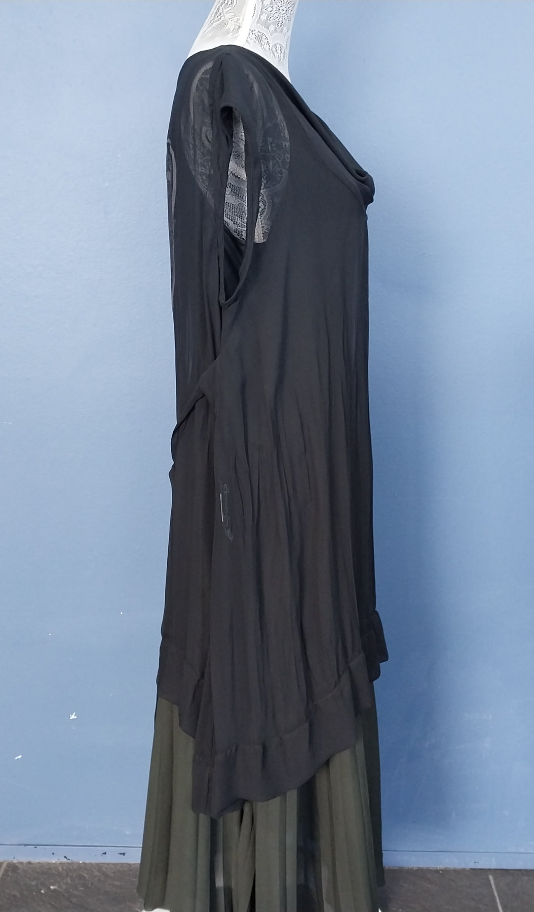 Annah Stretton long sheer black top in size L. Designed and manufactured in New Zealand. Featuring a flattering cowl neck and a self-tie belt that offers a graceful silhouette. The delicate heart and rose print on the back adds a unique, stylish touch. Measuring 54 cm across the chest on the flat ,and 81 cm from back neck to hem, this piece combines elegance with comfort. Aside from a tiny mark on the left shoulder, it remains in very good condition, making it a chic addition to your collection.