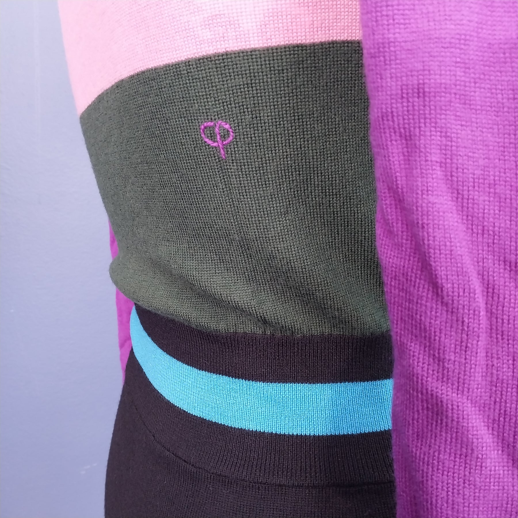This Chinti & Parker Pop Stripe Merino Wool Dress in size S showcases luxury knitwear craftsmanship with its figure-flattering design. Featuring a fitted top half and an A-line skirt in vibrant multi-coloured Pop Stripe Merino wool, it offers both style and comfort. Measuring 40 cm across the chest (flat) and 117 cm from back neck to hem, this dress perfectly balances elegance with a playful edge. Priced at $700 new, this As New piece is a stunning addition to any wardrobe. Elevate your look with this exclusive and versatile dress.