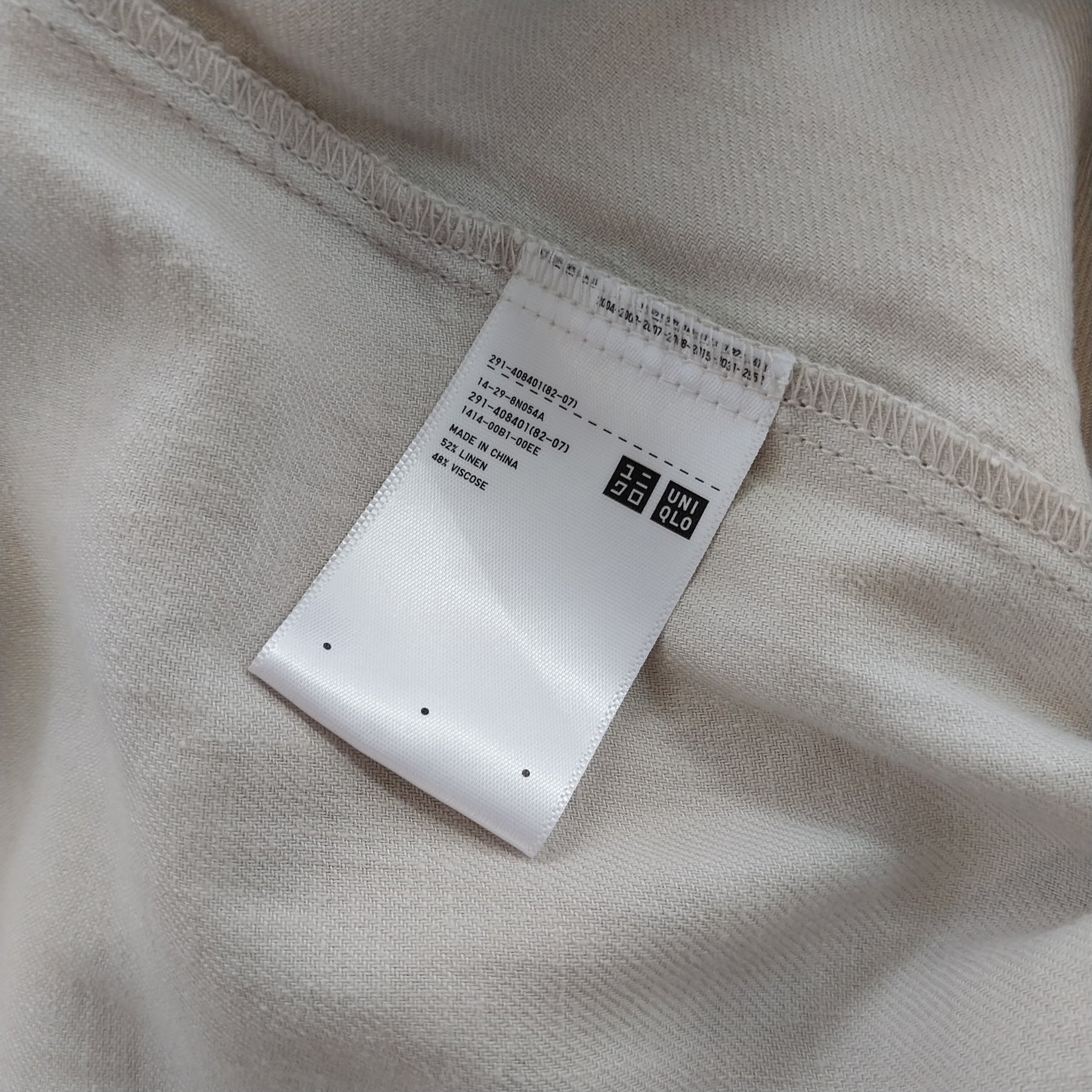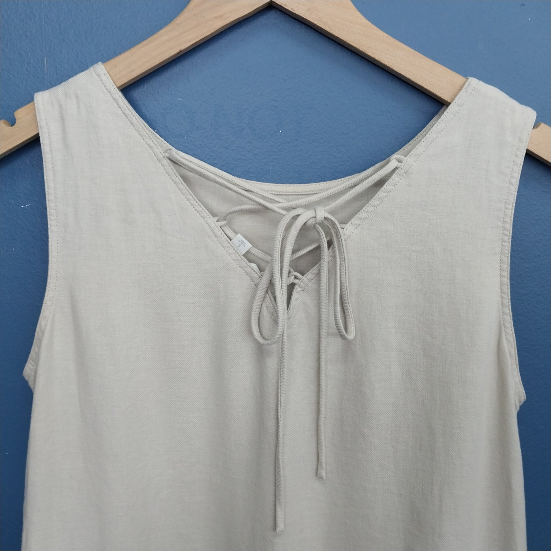 This UNI QLO Linen/Viscose shift dress in beige is your go-to for effortless style. Perfect layered up over pants or on its own, it features a  round neck with a lace-up V back that adds a cool touch. Side pockets keep it practical, while the slightly longer back hem gives a fun twist to your silhouette. Sized S, with a 47 cm flat width and lengths of 96 cm front and 107 cm back, it’s in very nice condition and ready to brighten your wardrobe.