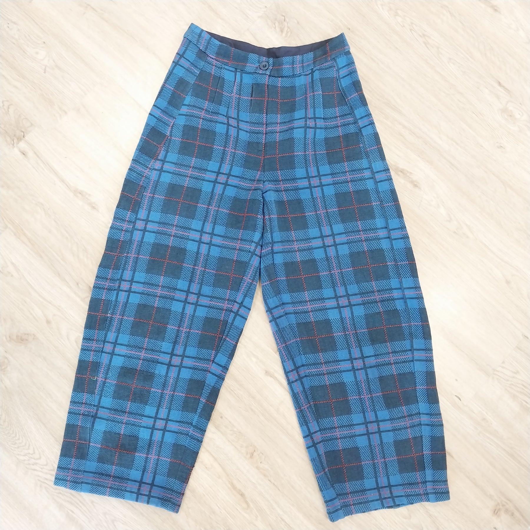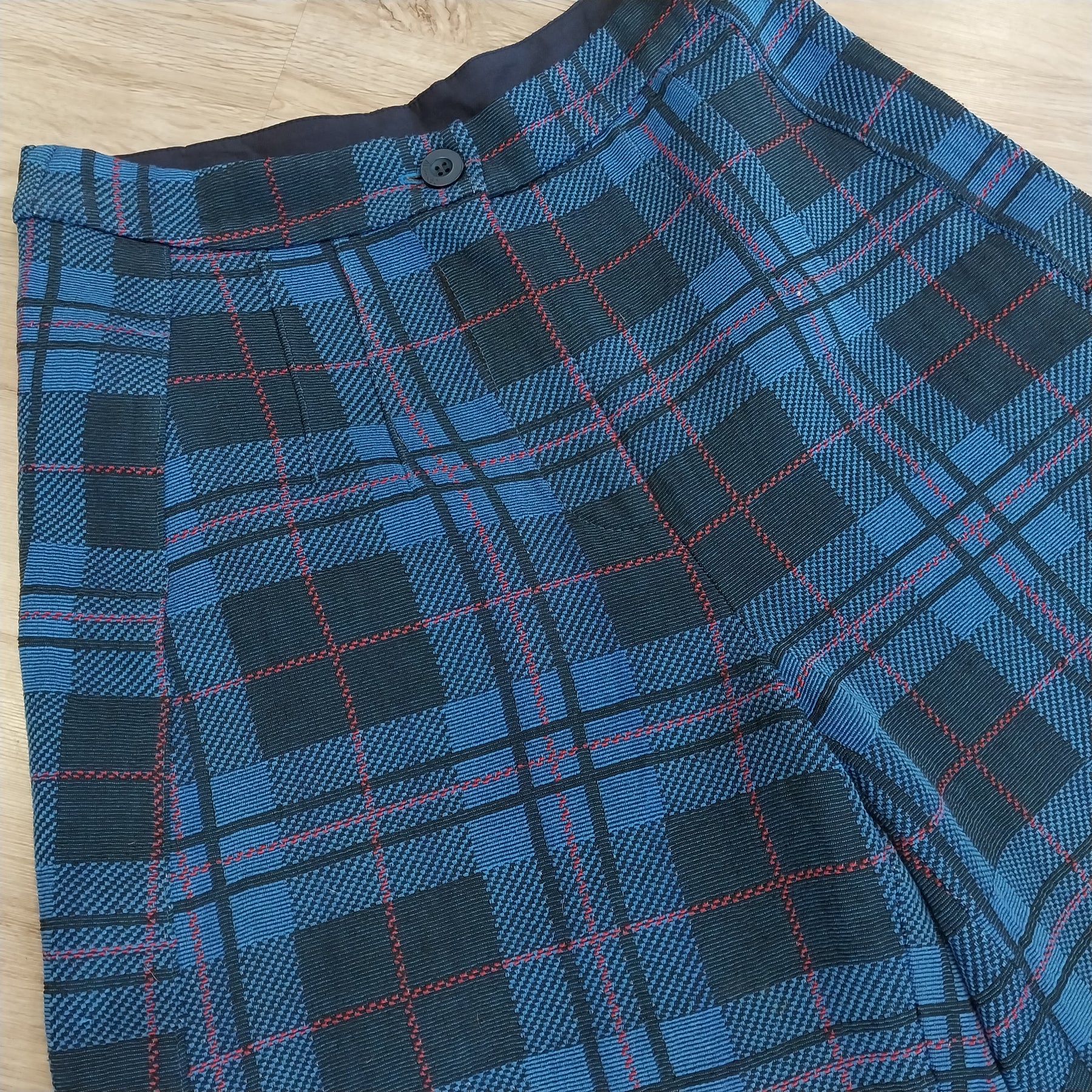 These Australian-designed Alpha 60 wide leg tartan pants in size S combine style and comfort effortlessly. Crafted from a cotton-polyester blend, they feature a zip fly and a flattering fit with a 39cm flat waist, 33cm rise, and 70cm inseam length. Their funky design makes them a standout piece, perfect for adding a bold touch to your wardrobe. In very good, as-new condition, these pants offer both quality and unique flair.