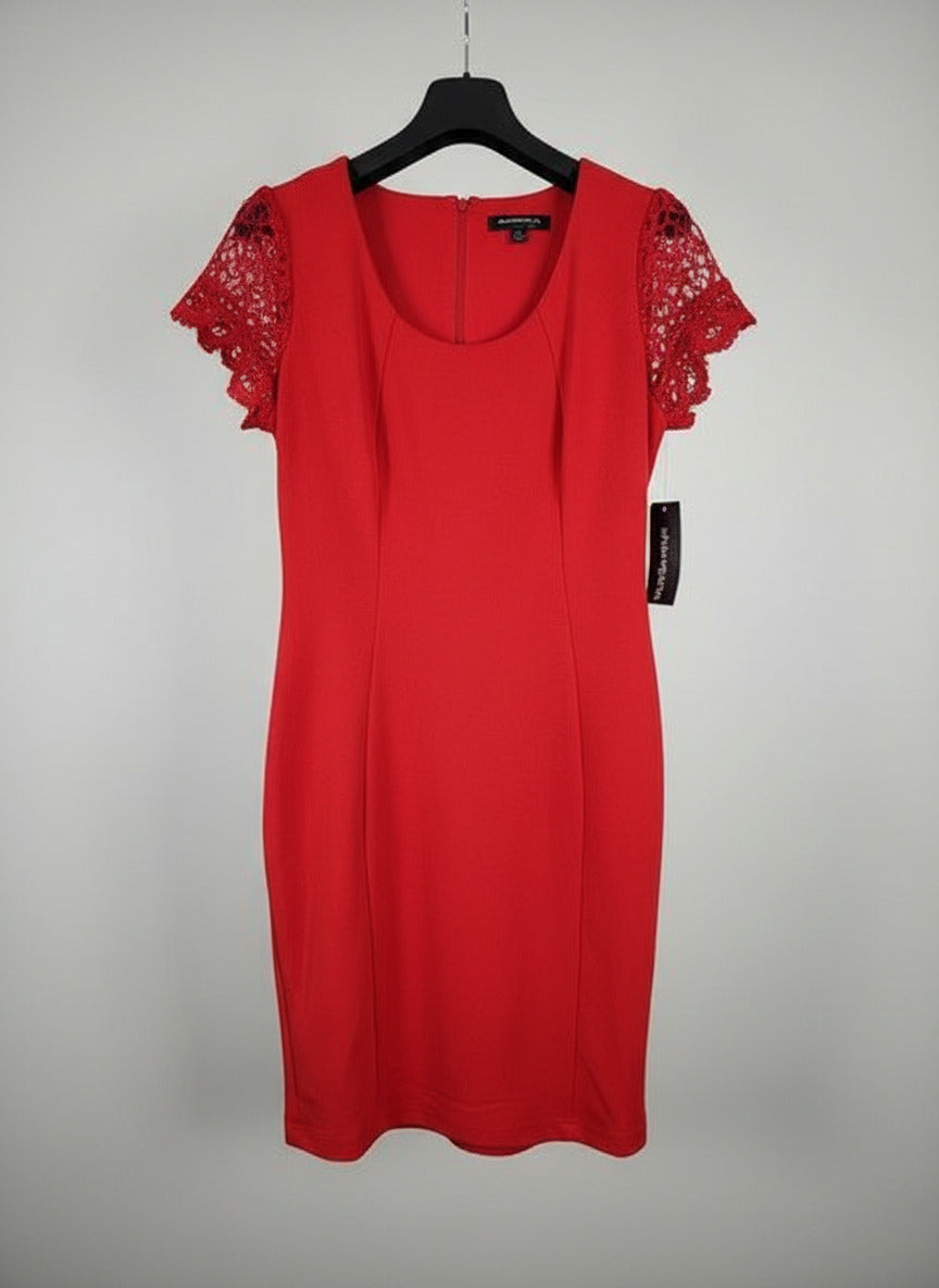 Make a bold impression in this striking Sharagno red sheath dress, designed to showcase your best self. The sleek sheath cut creates a refined silhouette that flatters every figure, while delicate lace cap sleeves introduce an unexpected layer of sophistication and grace. Whether you're attending a gala, celebrating a milestone, or simply want to feel confident and glamorous, this dress delivers timeless elegance with contemporary flair. Pristine condition with original tags attached, it's an investment piece ready to become a staple in your collection of show-stopping styles.
