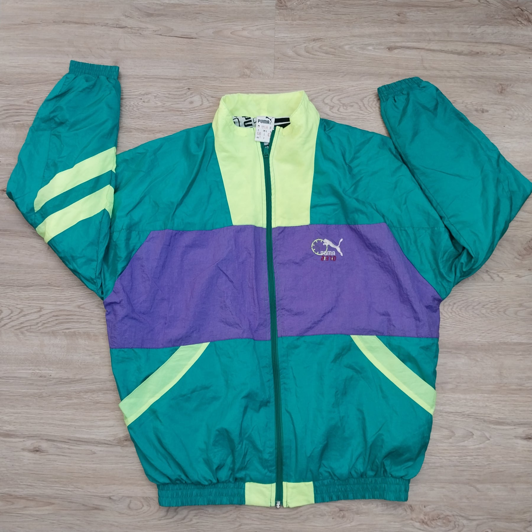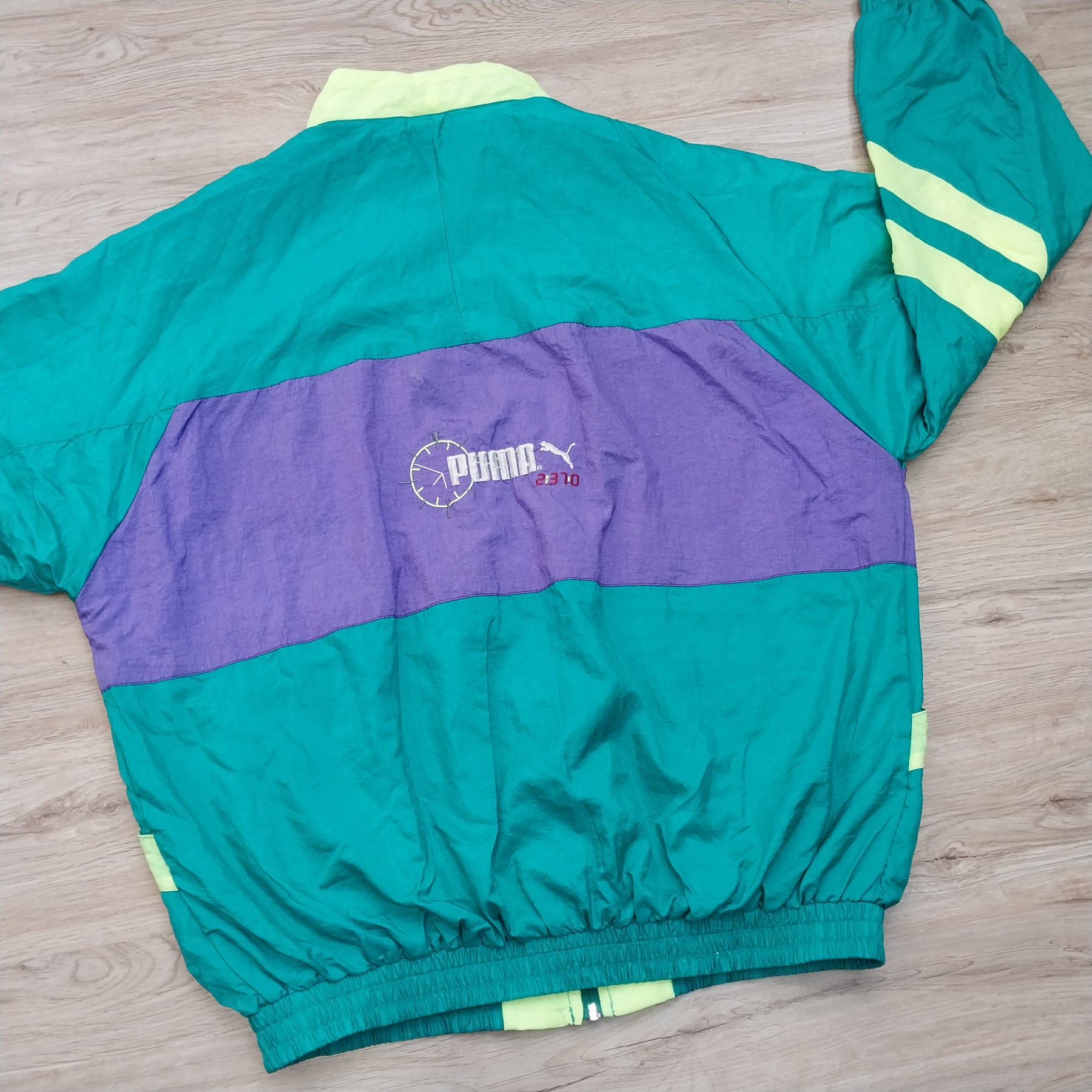 Step back in time with this classic PUMA windbreaker—a genuine piece of 80s/90s sportswear nostalgia! Featuring the iconic colour-block design that defined the era, this Size M/L jacket boasts a soft polyester-cotton lining for comfort and durability. The full zip closure and two front pockets make it practical for everyday wear, while the generous measurements (66cm UA to UA flat, 69cm back neck to hem) ensure a relaxed fit. In excellent condition with just one minor mark on the back, it's ready to elevate your vintage wardrobe. Complete the look by pairing it with the matching track pants sold separately!